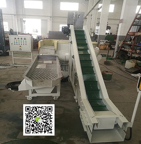 工件由上料輸送機(jī)構(gòu)連續(xù)輸送入工件槽容器內(nèi),工件槽下部的振動(dòng)器總成高速旋轉(zhuǎn)產(chǎn)生強(qiáng)大的激振力,通過彈簧的作用使容器產(chǎn)生規(guī)律性振動(dòng),容器中的切削磨塊和工件在容器中作環(huán)狀螺旋運(yùn)動(dòng)互相擠壓磨削,把工件的毛刺及氧化層去掉。去毛刺后的工件及磨塊從工作槽容器的出口進(jìn)入振動(dòng)分選清洗機(jī)將工件和磨塊分離,分離后的磨塊進(jìn)入磨料返回輸送機(jī)關(guān)到光整機(jī)工件槽容器內(nèi)循環(huán)工件,小的廢磨塊及碎片進(jìn)入廢料收集箱,同時(shí)工件進(jìn)入分選 澆菜同的清洗室進(jìn)行清洗,清洗干凈的工件再進(jìn)入網(wǎng)帶式烘干機(jī)進(jìn)行干燥處,干燥后的工件再進(jìn)入后道工序添加劑由液劑自動(dòng)供給裝置壓入光整機(jī)容器內(nèi)使用。